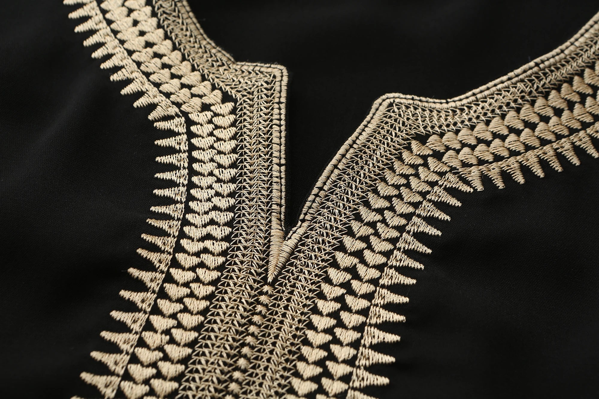 Denne sorte thobe i marokkansk stil skiller sig ud med sine omhyggeligt broderede guld detaljer og sit majestætiske udseende. Den løse pasform sikrer stor bevægelsesfrihed, samtidig med at den bevarer en elegant silhuet. Perfekt til fejring, bønner eller pæne udflugter.