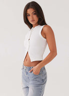 Denne ærmeløse top kombinerer en flatterende tætsiddende pasform med en række elegante knapper. Nem at matche, den passer til både et afslappet look og en mere elegant påklædning. Et let og trendy must-have til den smukke sæson.