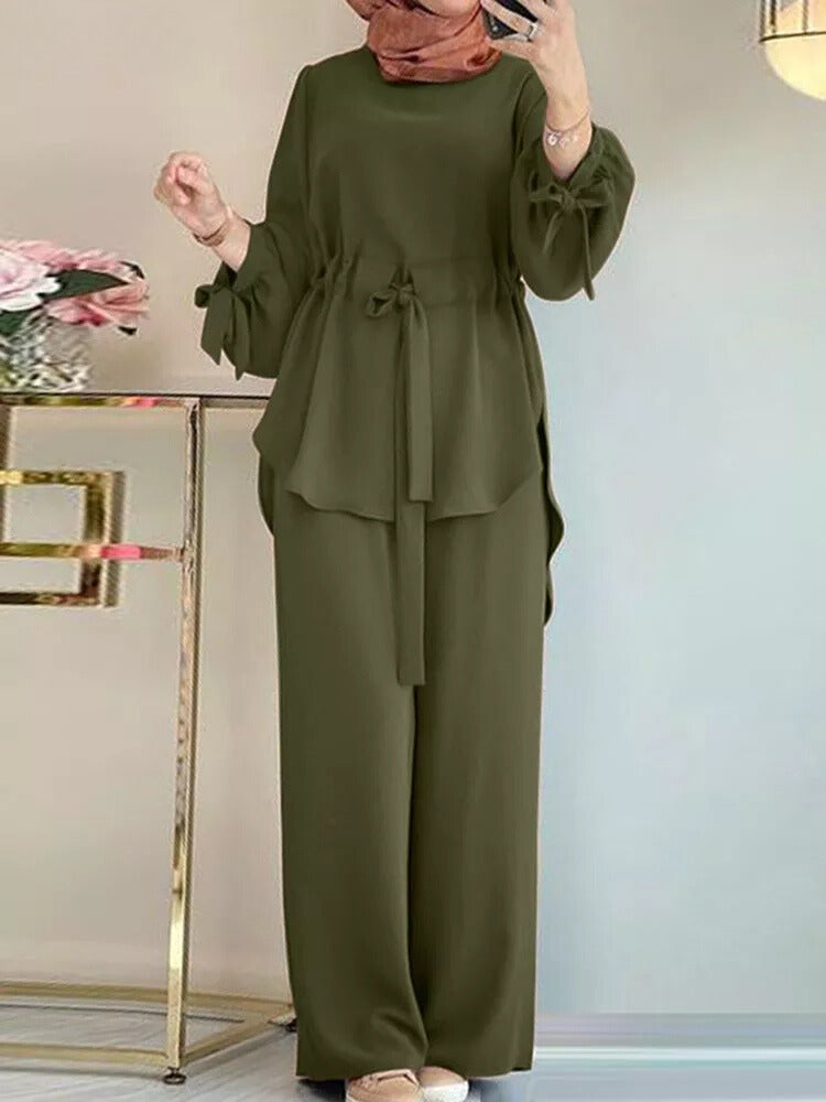 Vielseitig und raffiniert, vereint dieses zweiteilige Set Komfort und Stil. Es besteht aus einer langen Tunika und einer fließenden Hose und eignet sich sowohl für elegante Ausgänge als auch für den Alltag.