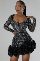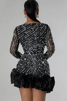 Αυτή η μίνι φόρεμα είναι διακοσμημένη με λαμπερούς κρυστάλλους. Ο βαθύς V-λαιμός της και τα μακριά, εφαρμοστά μανίκια προσφέρουν μια κομψή σιλουέτα. Ιδανική για βραδιές και ειδικές εκδηλώσεις.
