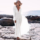 Αυτή η μακριά λευκή φόρεμα προσφέρει μια ρευστή και άνετη γραμμή για μέγιστη άνεση. Το βαθύ ντεκολτέ και οι λεπτομέρειες στη κεντητική προσθέτουν μια πινελιά θηλυκότητας. Ιδανική για καλοκαιρινές βραδιές, προσαρμόζεται σε όλες τις περιστάσεις.