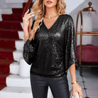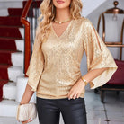 This blouse highlights the silhouette with its refined V-neck and gracefully flowing bell sleeves. The sparkling sequins add a subtle touch of glamour to your look. Ideal for evenings or special occasions, it combines sophisticated style with absolute comfort.