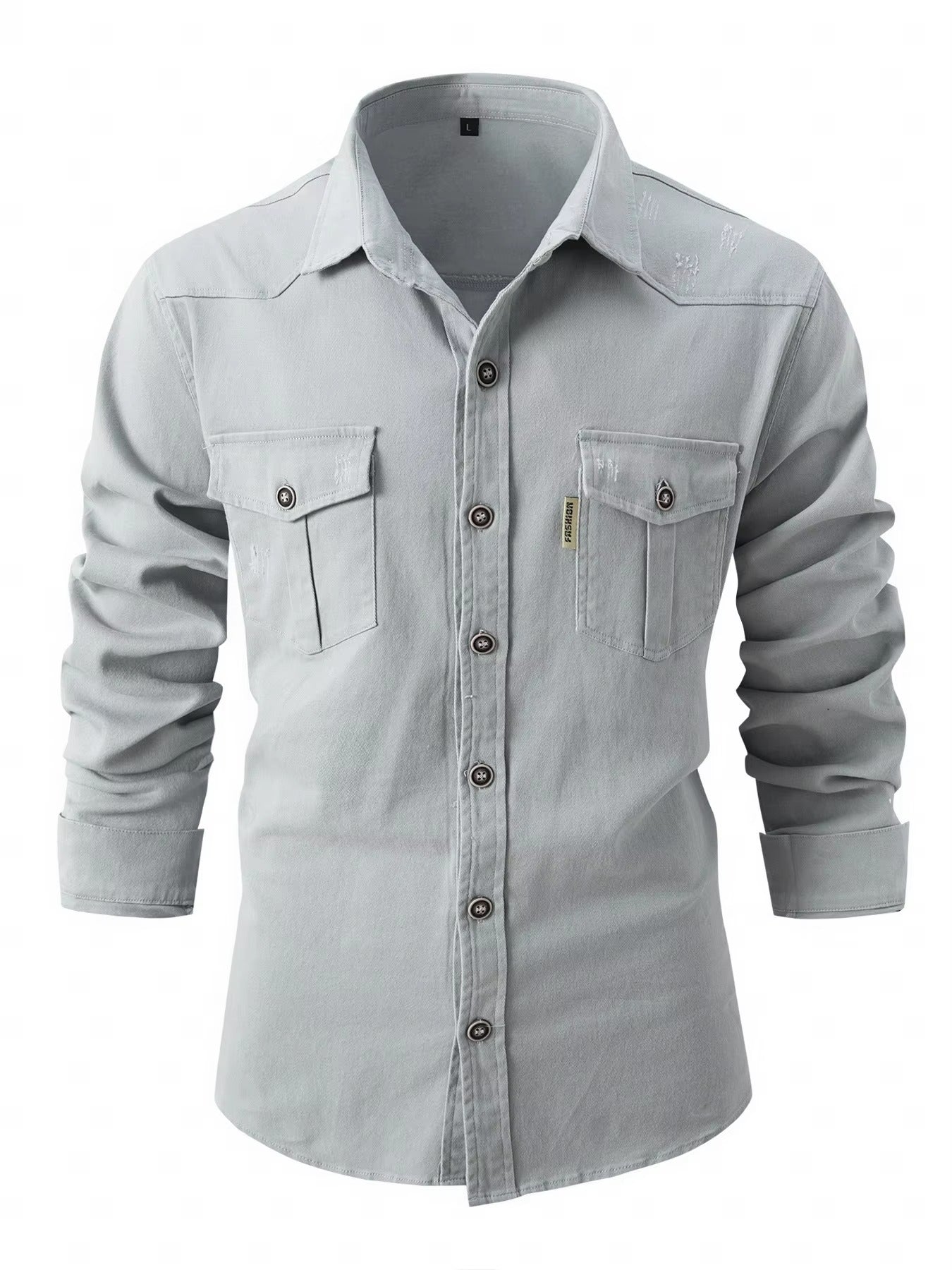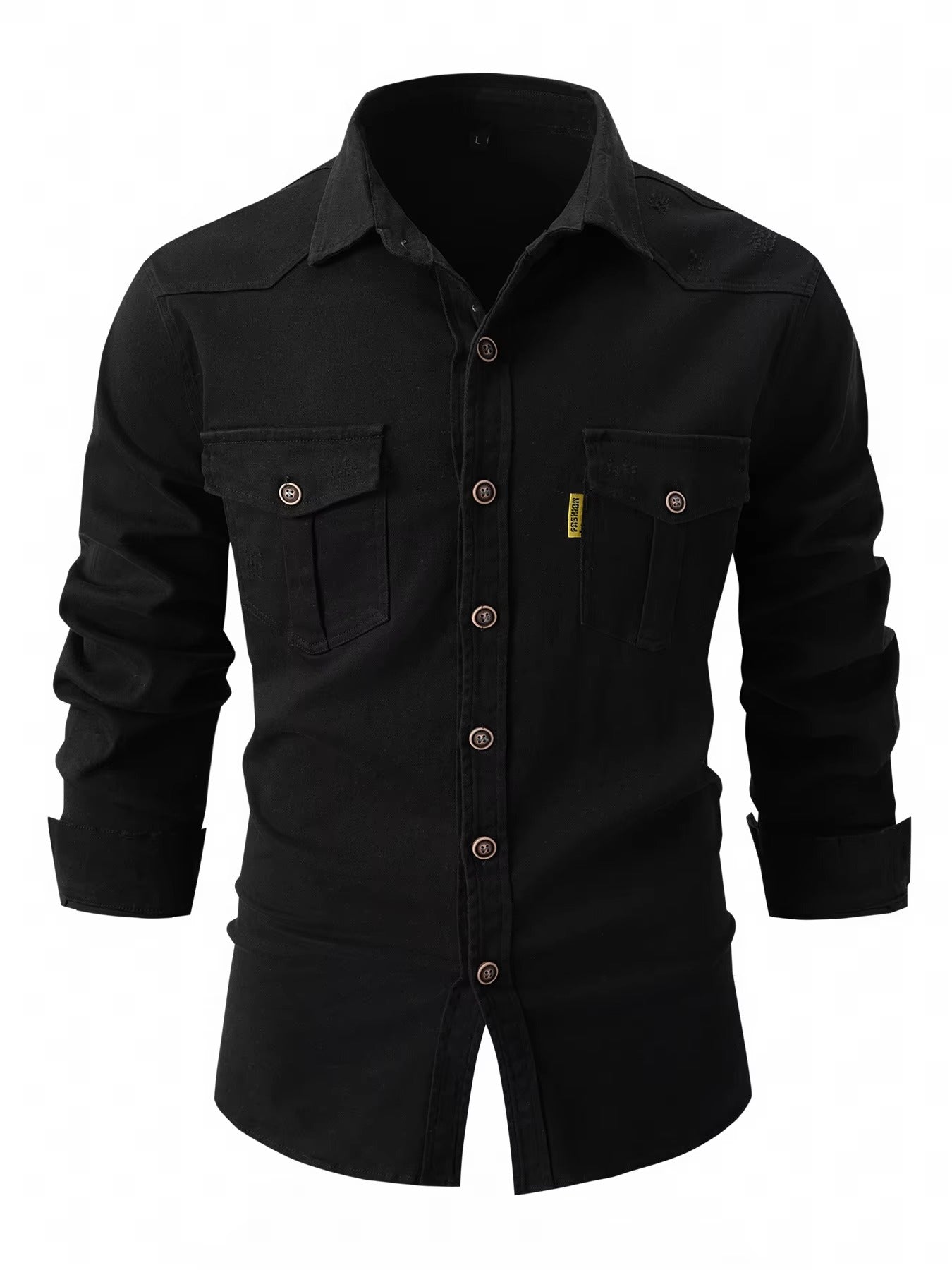 Esta camisa de manga larga está hecha de denim en tonos contrastantes. Presenta un cuello clásico con solapas y una tapeta de botones central, ofreciendo un estilo a la vez estructurado y desenfadado. Los bolsillos de solapa en el pecho añaden una dimensión funcional. Su corte limpio es adecuado para una variedad de ocasiones, desde el día a salidas más elegantes.