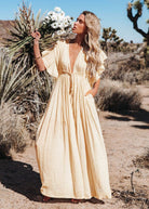 השמלה הארוכה והזורמת הזו מציעה חתך רחב וקליל. הצווארון העמוק מדגיש את הסילואט. מושלמת לימים קיץ או לערבים אלגנטיים.