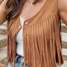 Ez a ujjatlan dzseki elegáns bojtokkal és kifinomult gomb részletekkel rendelkezik. Időtlen dizájnja különböző alkalmakhoz illik. Tökéletes a kedvenc ruháidra való rétegezéshez.