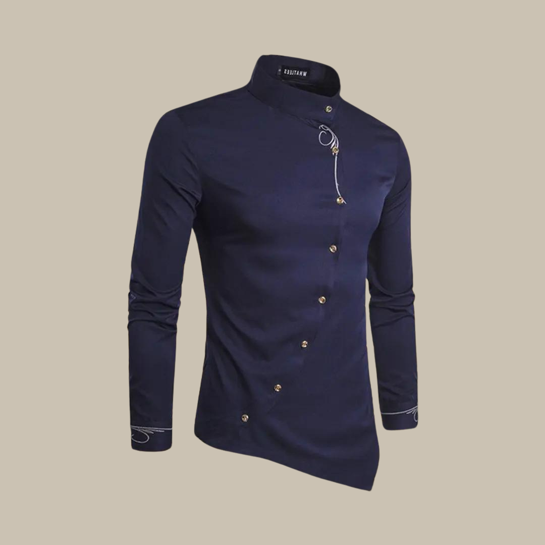 Ez a hosszú ujjú ing jellegzetes ferde gombzárral rendelkezik. Klasszikus szabása kényelmes és elegáns illeszkedést biztosít. Tökéletes formális vagy hétköznapi alkalmakra.