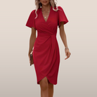 Questo abito a portafoglio presenta un collo a V lusinghiero e maniche a farfalla leggere. La vita plissettata e la gonna incrociata valorizzano la silhouette con eleganza. Perfetto per cene, feste o una serata in città.