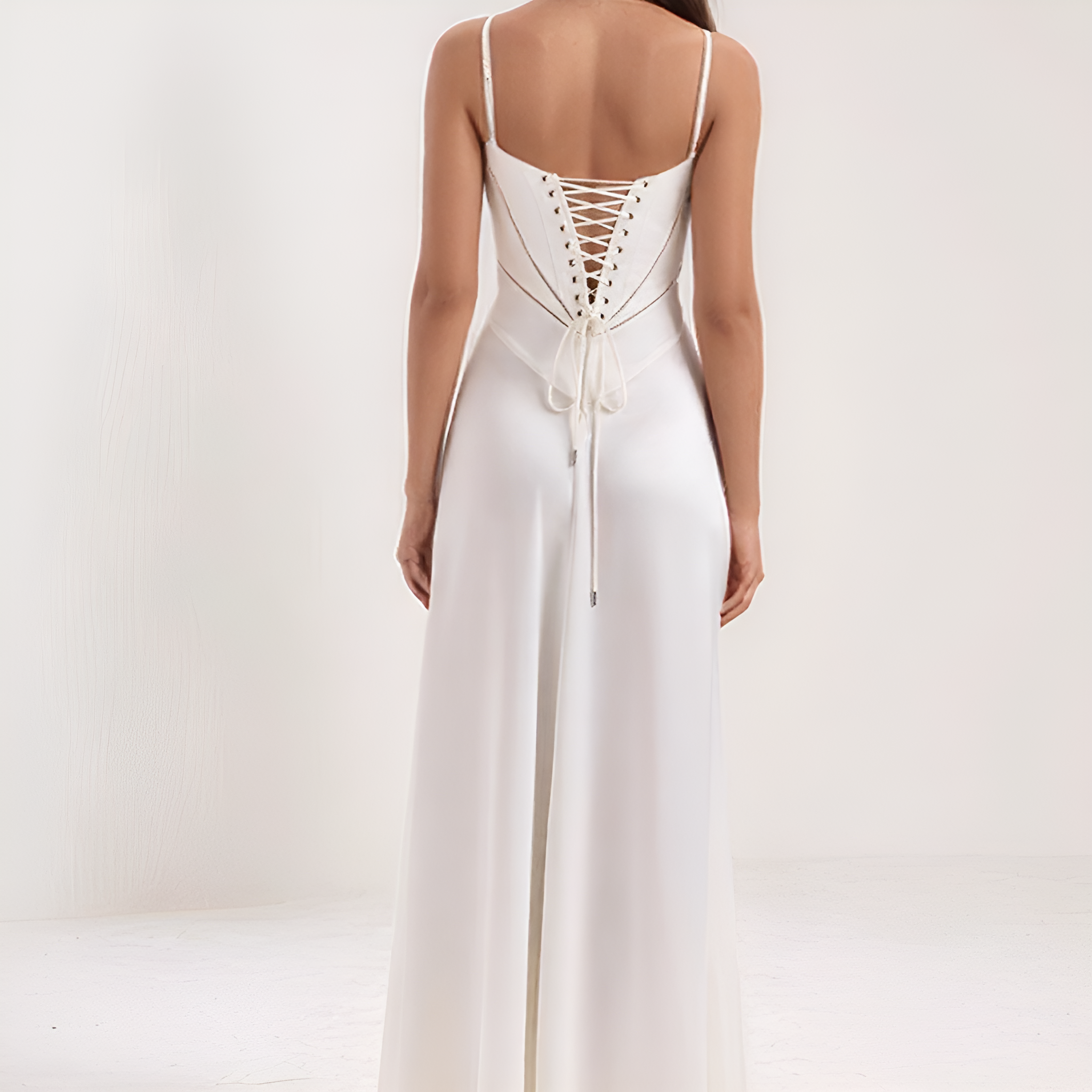 Questo abito lungo valorizza la silhouette grazie al suo corpetto stile corsetto che sottolinea delicatamente la vita. La sua linea fluida conferisce movimento e grazia, mentre la schiena corsettata aggiunge un tocco romantico e strutturato. Ideale per serate, galà o cerimonie.