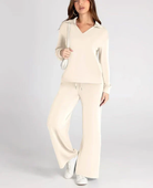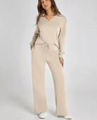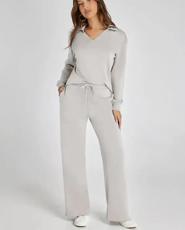 Questo completo a due pezzi con colletto unisce morbidezza ed eleganza. Perfetto per rilassarsi a casa o per uscite informali. Disponibile in diversi colori per adattarsi al tuo stile.