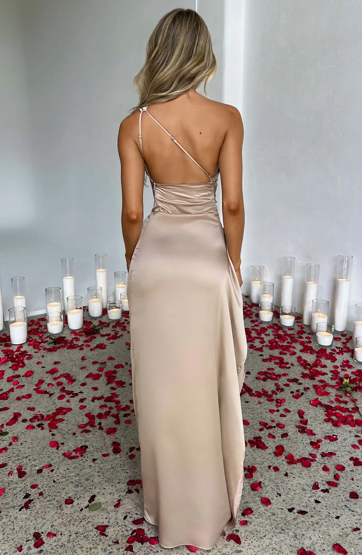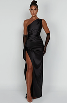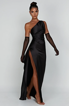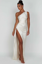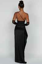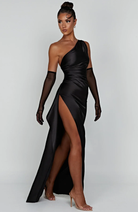 Questo abito lungo dal design asimmetrico è impreziosito da una fessura laterale. La sua silhouette elegante e confortevole lo rende una scelta ideale per serate ed eventi formali.