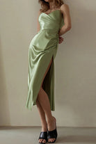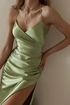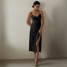 このミディ丈のスリットドレスは、流れるようなシルエットとエレガントに体を引き立てる細いストラップで魅了します。Vネックのデザインは上半身を引き立て、サイドスリットが軽やかさと女性らしさを加えます。晴れた日や夏の夜に最適で、シンプルに快適さとスタイルを兼ね備えています。