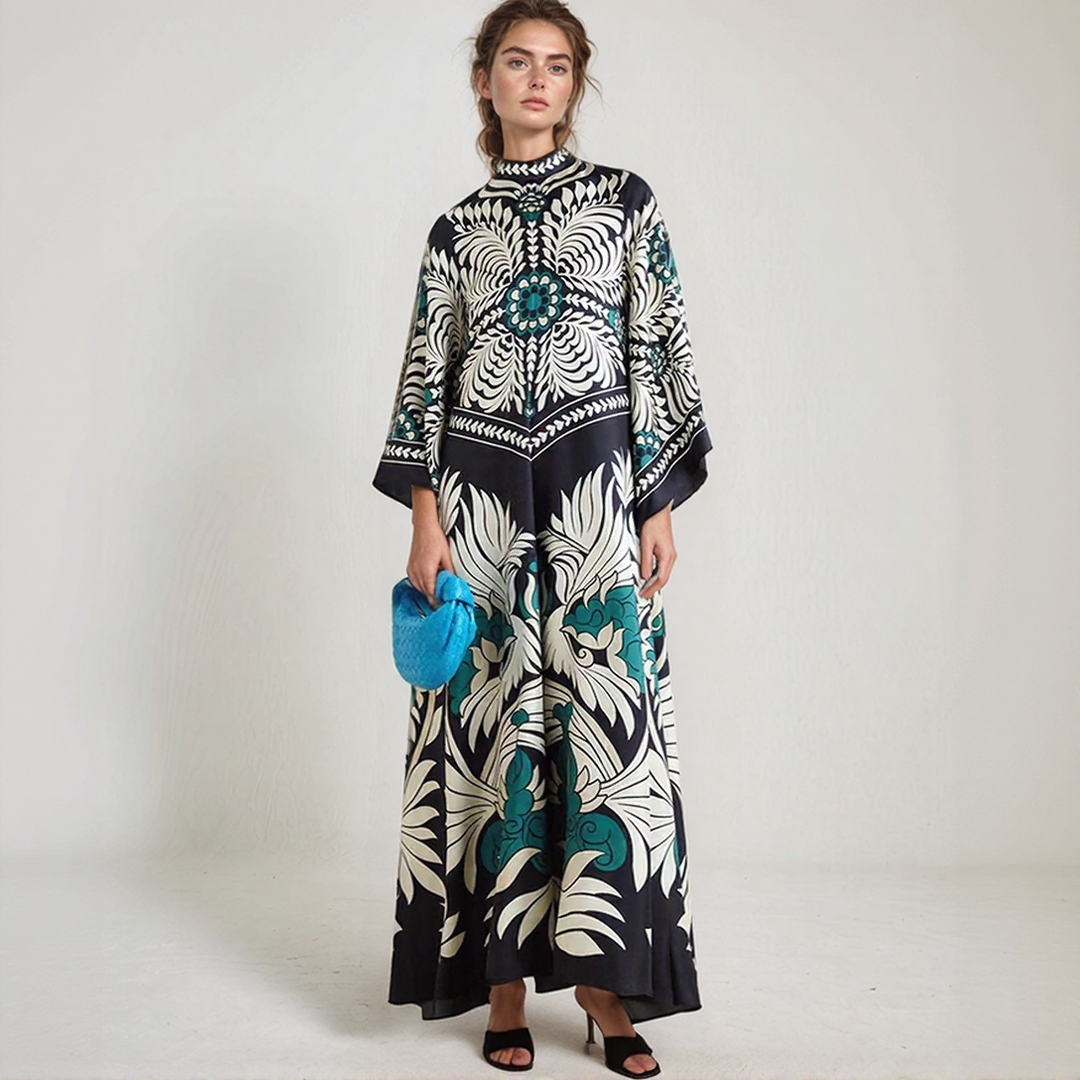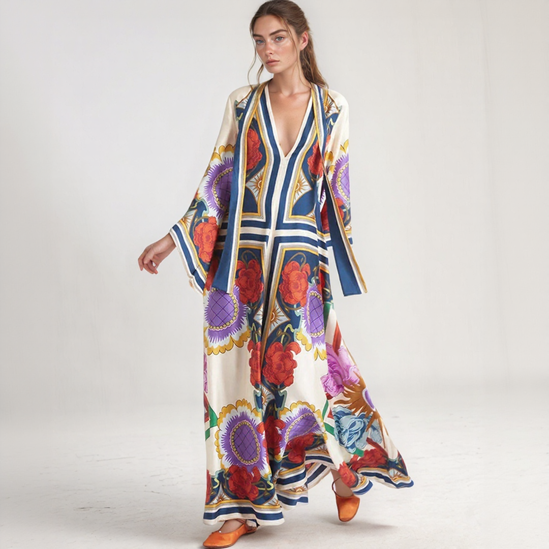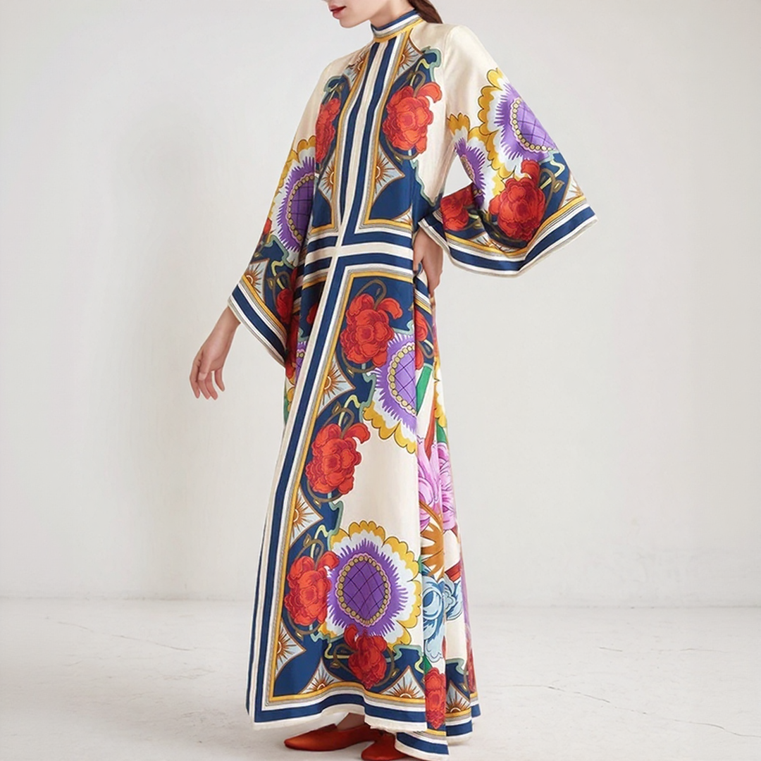 Deze lange jurk heeft gedurfde bloemenmotieven en een vloeiende snit. De hoge hals met strikdetail op de rug voegt een verfijnde toets toe. Perfect voor alle seizoenen, biedt het tijdloze bohemiaanse elegantie.