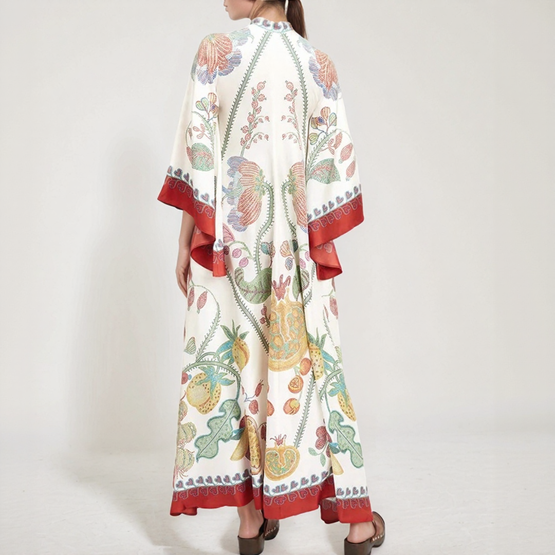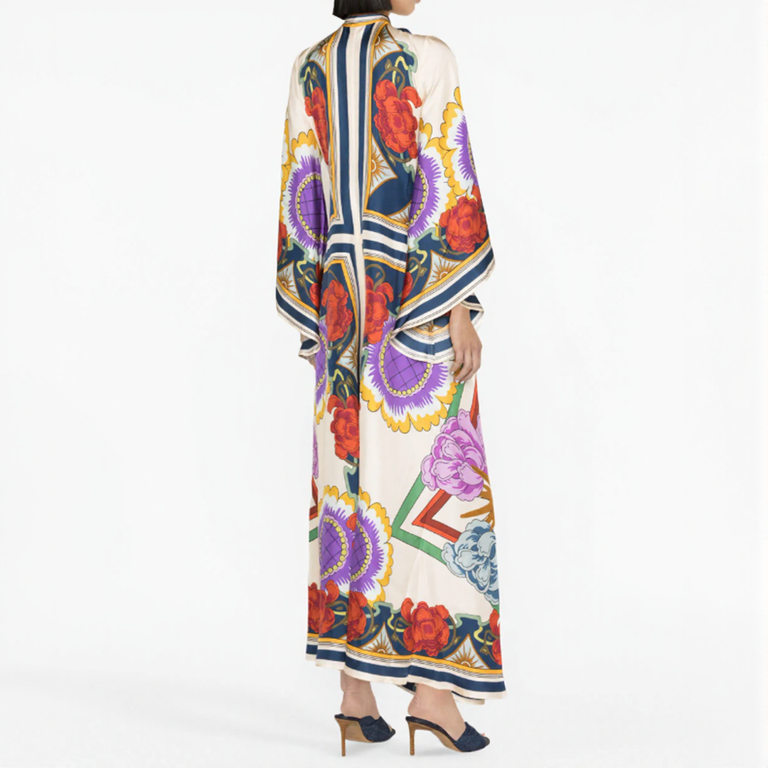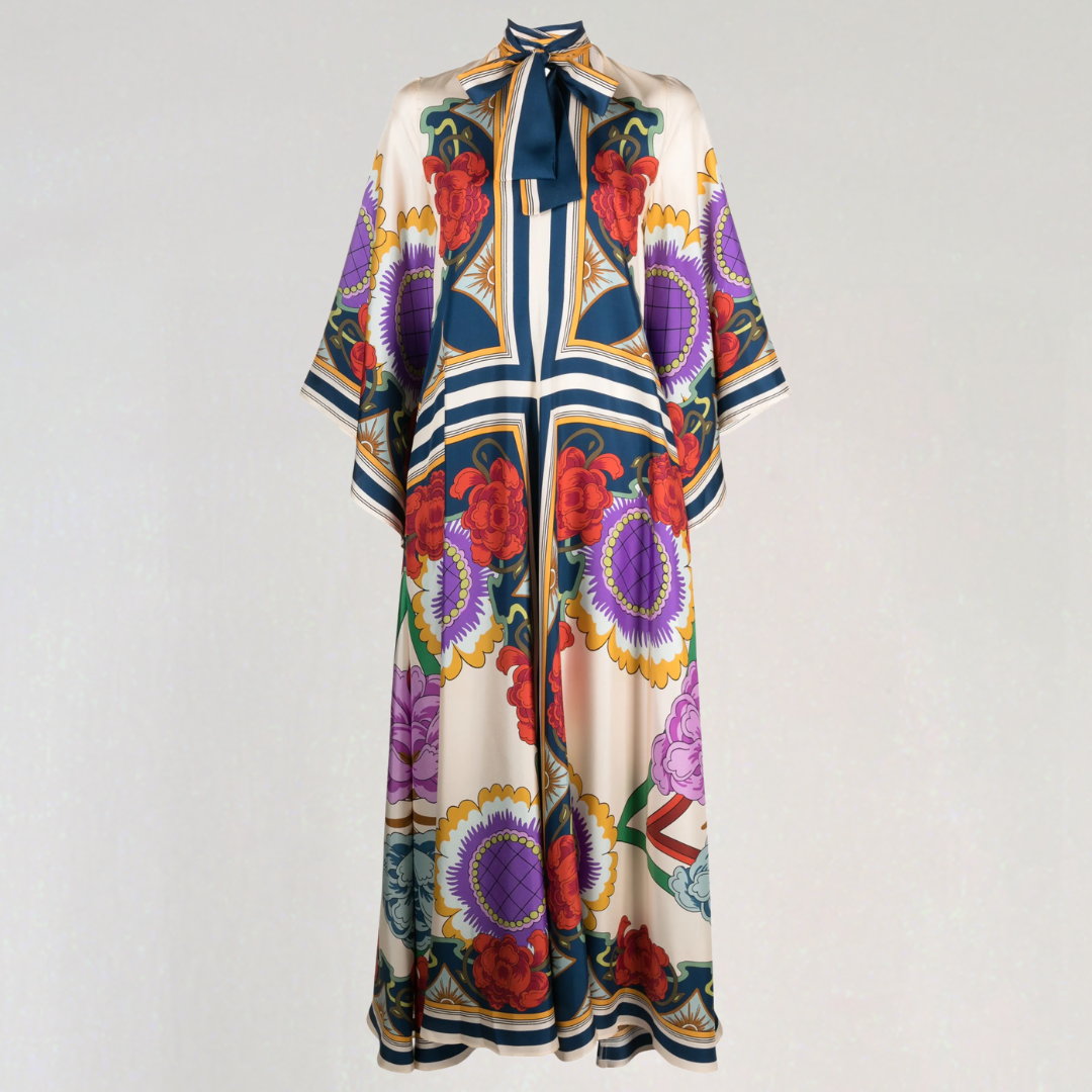 Deze lange jurk heeft gedurfde bloemenmotieven en een vloeiende snit. De hoge hals met strikdetail op de rug voegt een verfijnde toets toe. Perfect voor alle seizoenen, biedt het tijdloze bohemiaanse elegantie.