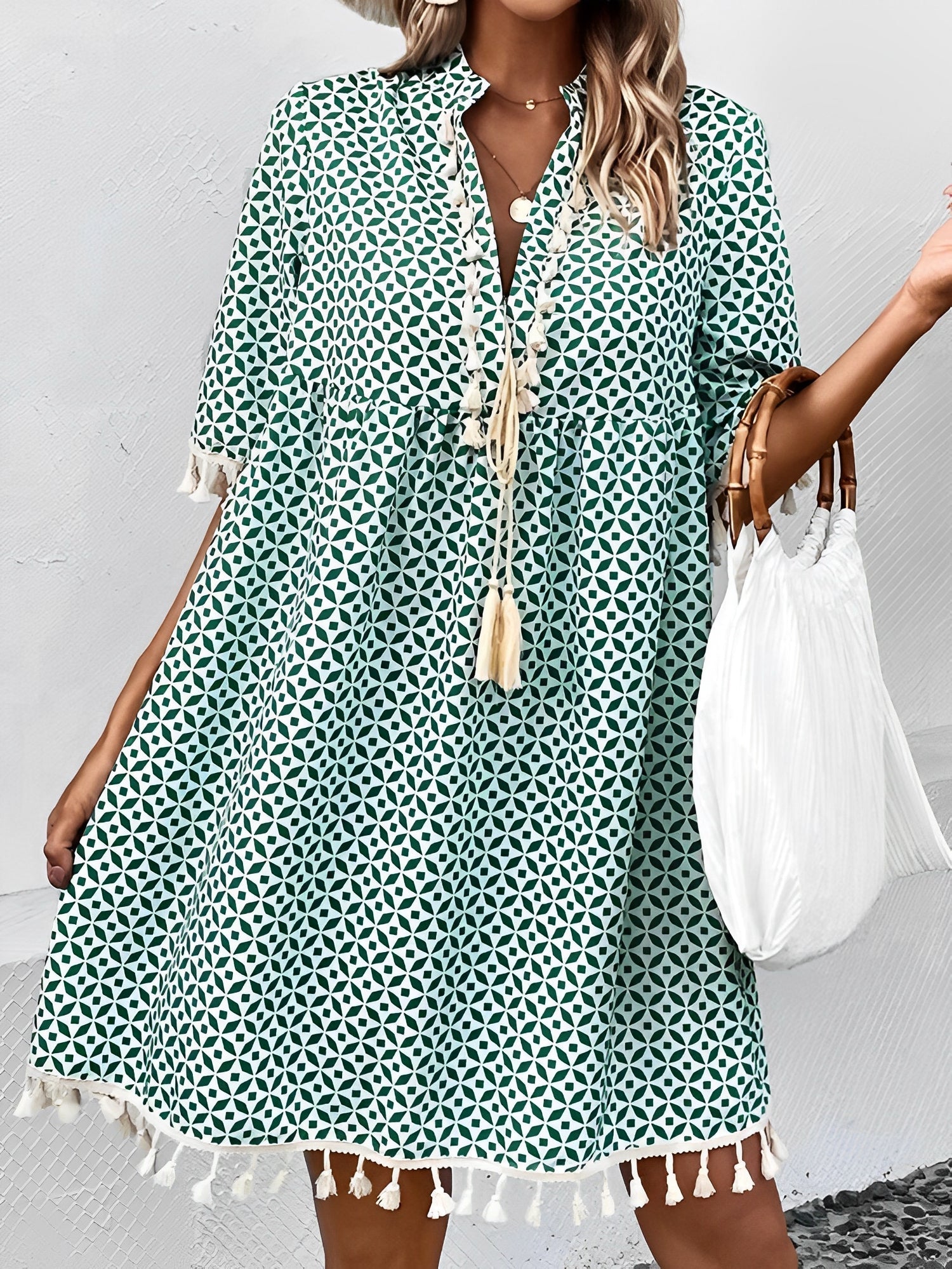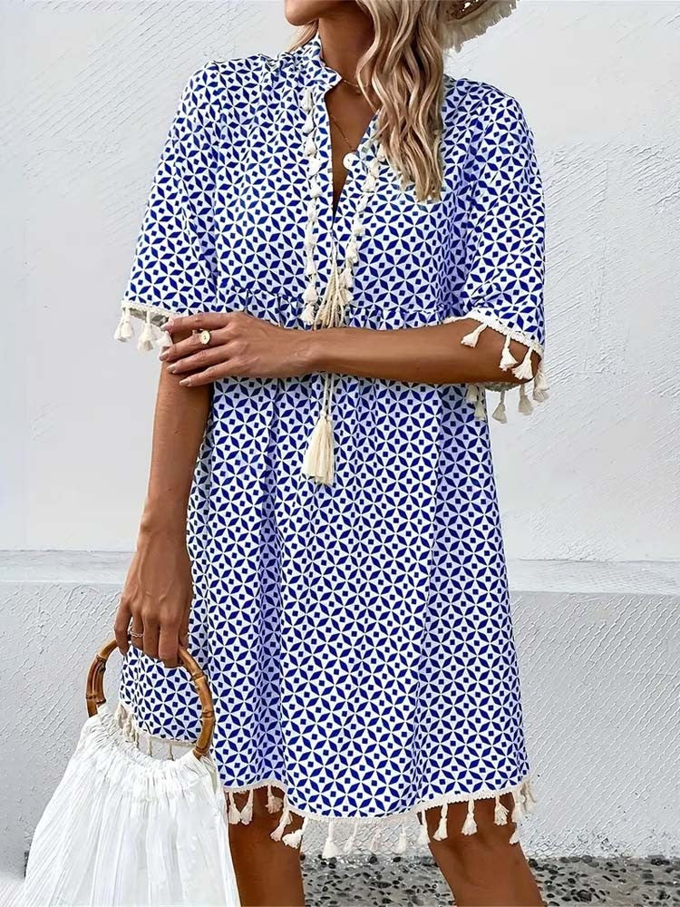Această rochie de vară are un imprimeu modern și o croială confortabilă. Mâneca scurtă și ușurința ei o fac o alegere ideală pentru zilele însorite. Perfectă pentru oraș, vacanțe sau o ieșire cu prietenii.
